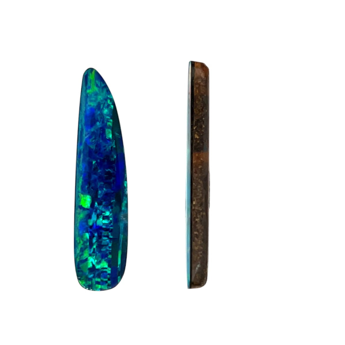 Doublet opals are a thin slice of translucent opal joined by an epoxy resin to a backing, usually either made from black potch or ironstone. The opal is cut thin, which makes the translucent opal look darker once placed on the dark backing, giving it the resemblance of a black or boulder opal. The purpose of doublet opals is to provide an economical alternative to the gem quality black or boulder opals, as their value is only a fraction of the cost of the real solid opal. They can be distinguished by looking at them from the cross section, where a straight distinct line can depict the different layers.