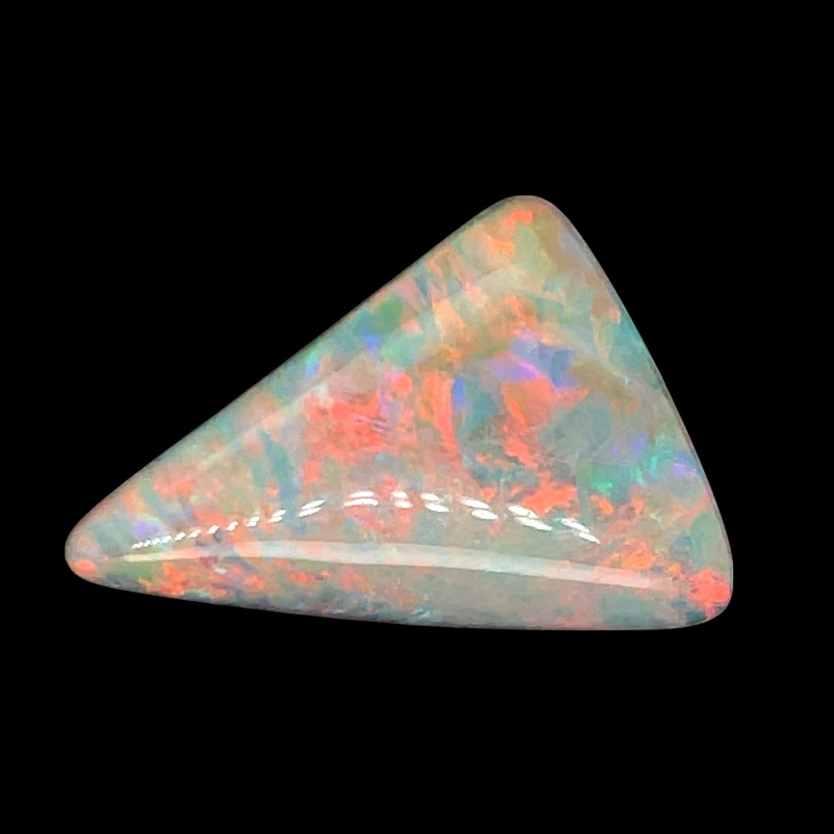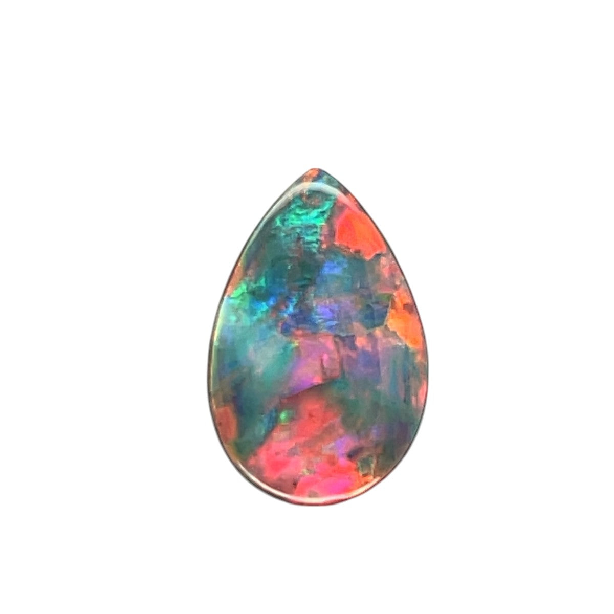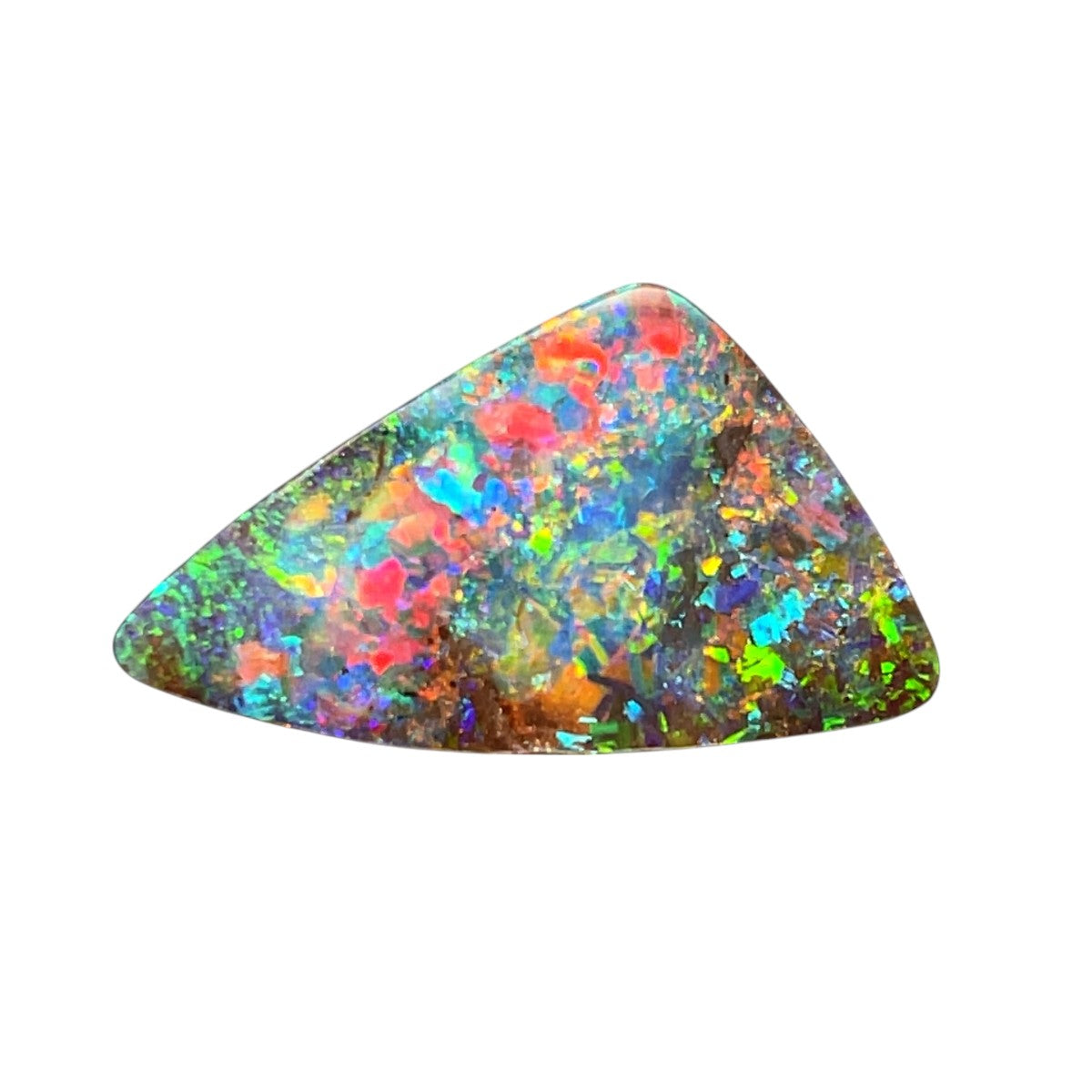 The most desired shape for opal is a domed cabochon oval with a length about 40% greater than the width and the height 60% of the width, which is quite rare to find. These types of opals are priced at a premium, as so much opal is lost in the cutting. More commonly, opal is cut in irregular or elongated ovals, tear drops, or round to maximise the opal’s natural shape. It can also be sliced thinly, as is the case with triplet and doublet opals. Flat or excessively thick stones can devalue a stone, all things being equal.
