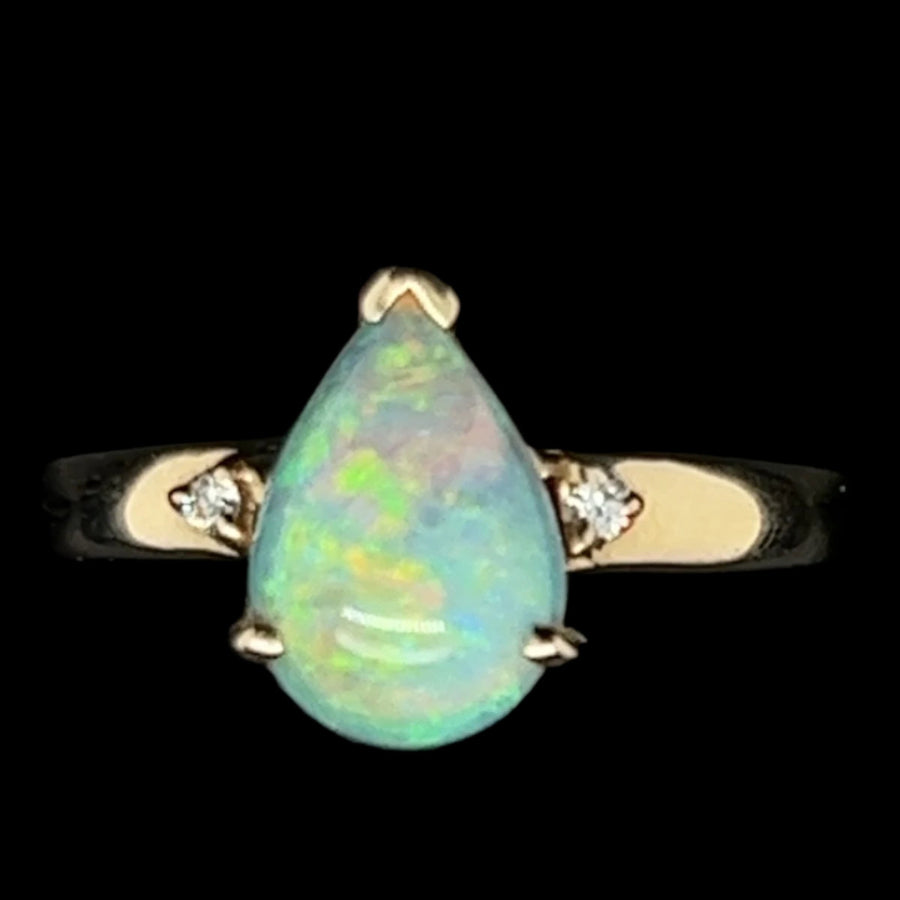 Unit price perThis gorgeous crystal opal ring is set in 14ct yellow gold and accompanied by two brilliant diamonds. This drop opal was mined in Coober Pedy, Located in South Australia and has a weight of 1.10ct.Ring Size: N 1/2.