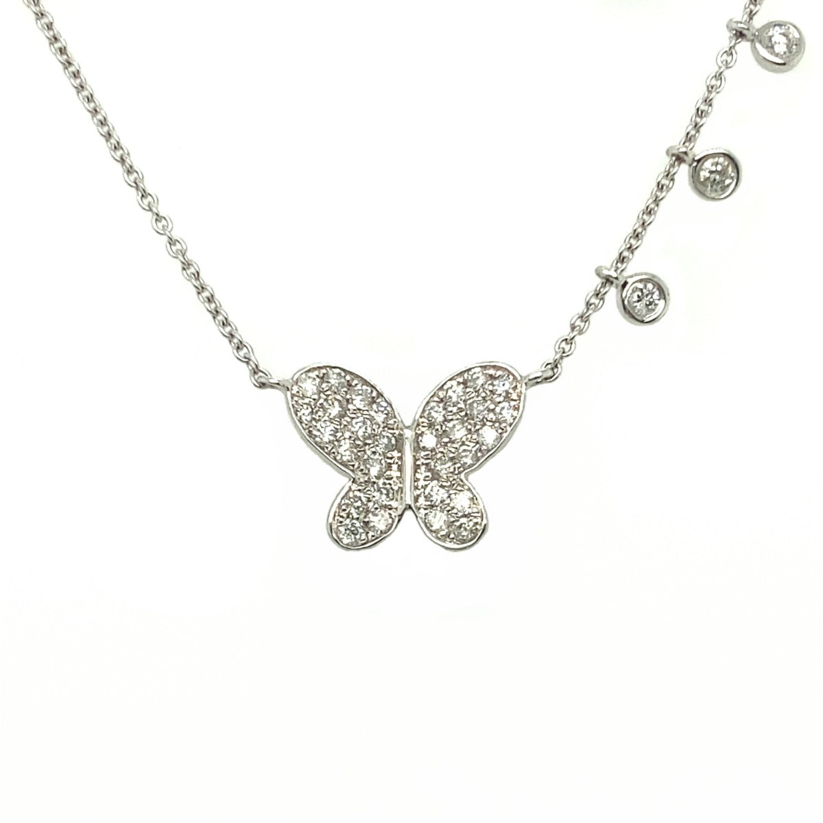 This beautiful 14ct White Gold Butterfly necklace is surrounded by a cluster of brilliant cut Diamonds and 3 single hanging brilliant cut Diamonds, weighing a total of 0.28ct.