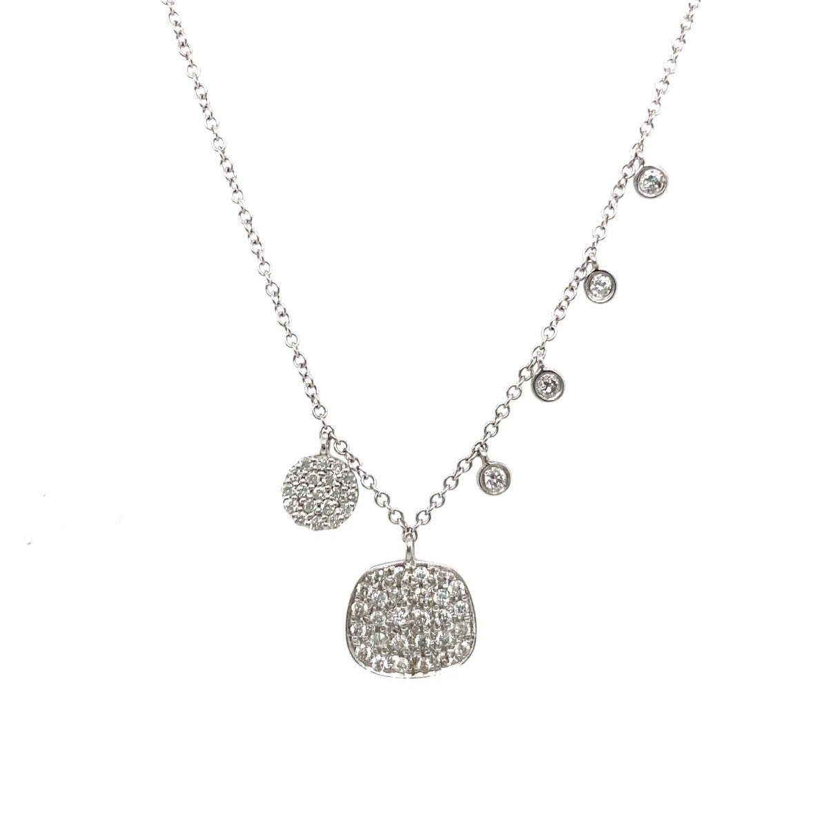 This elegant 14ct White Gold Necklace is surrounded by 2 clusters of brilliant cut diamonds and 4 single hanging diamonds, weighing a total of 0.32ct.
