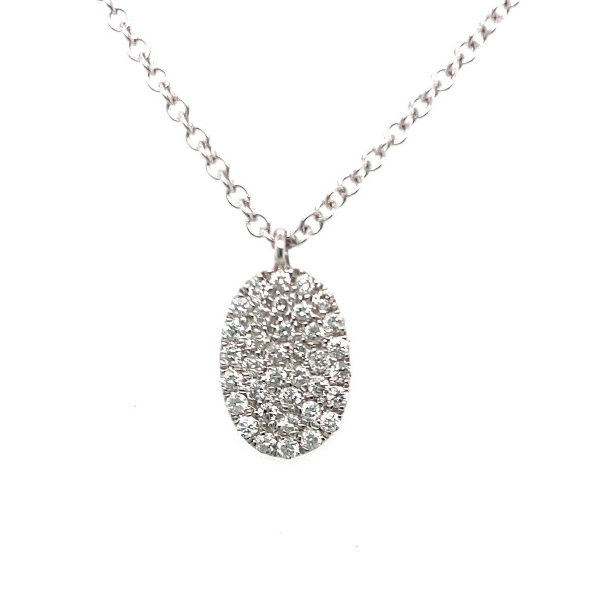 This adorable 14ct White Gold Oval Pendant is surrounded by a cluster of brilliant cut diamonds, weighing a total of 0.18ct.