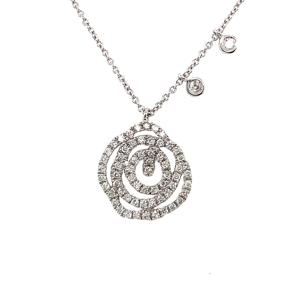 This stunning 14ct white gold necklace is set with an array of brilliant cut diamonds and is accompanied by two single hanging diamonds, weighing a total of 0.30ct.