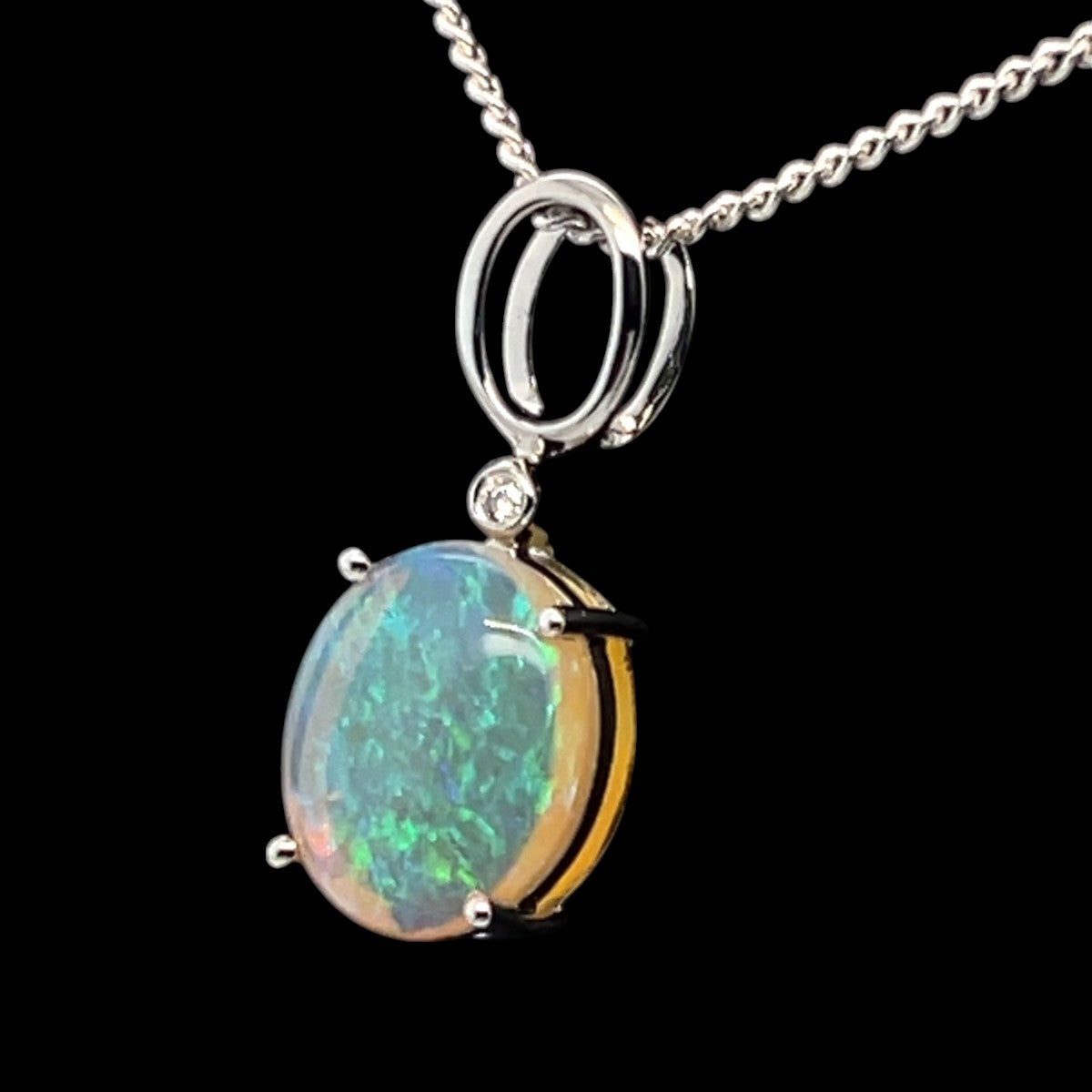 Unit price perSolid crystal opal pendant set in 14ct white gold with beautiful blue green colours and a brilliant cut diamond