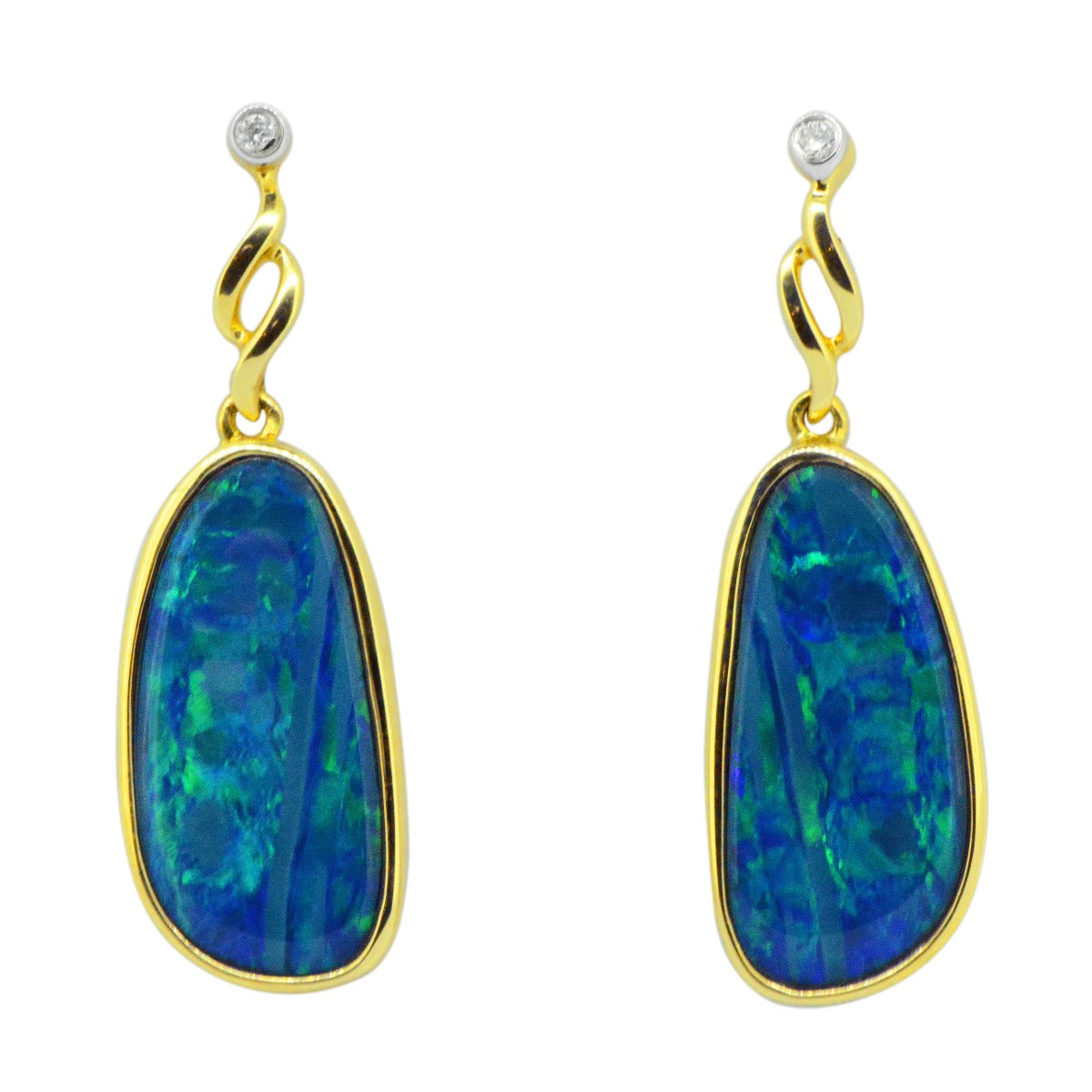 Unit price per14ct Yellow Gold Doublet Opal Earrings, opal size 20mmX9mm set with two brilliant cut diamonds, earring length 34mm