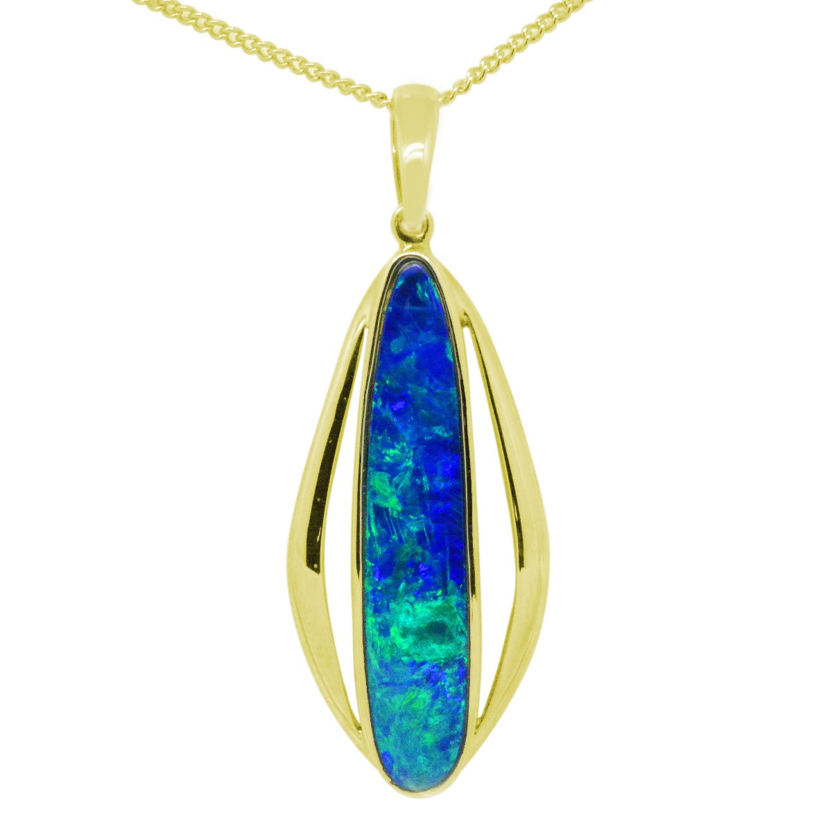 Unit price perSet in 14ct Yellow Gold, This Pendant is Fitted with a Doublet Opal with Magnificent Deep Blue and Vibrant Green Play. This Doublet is 7mm(w)X34mm(h) in Size.