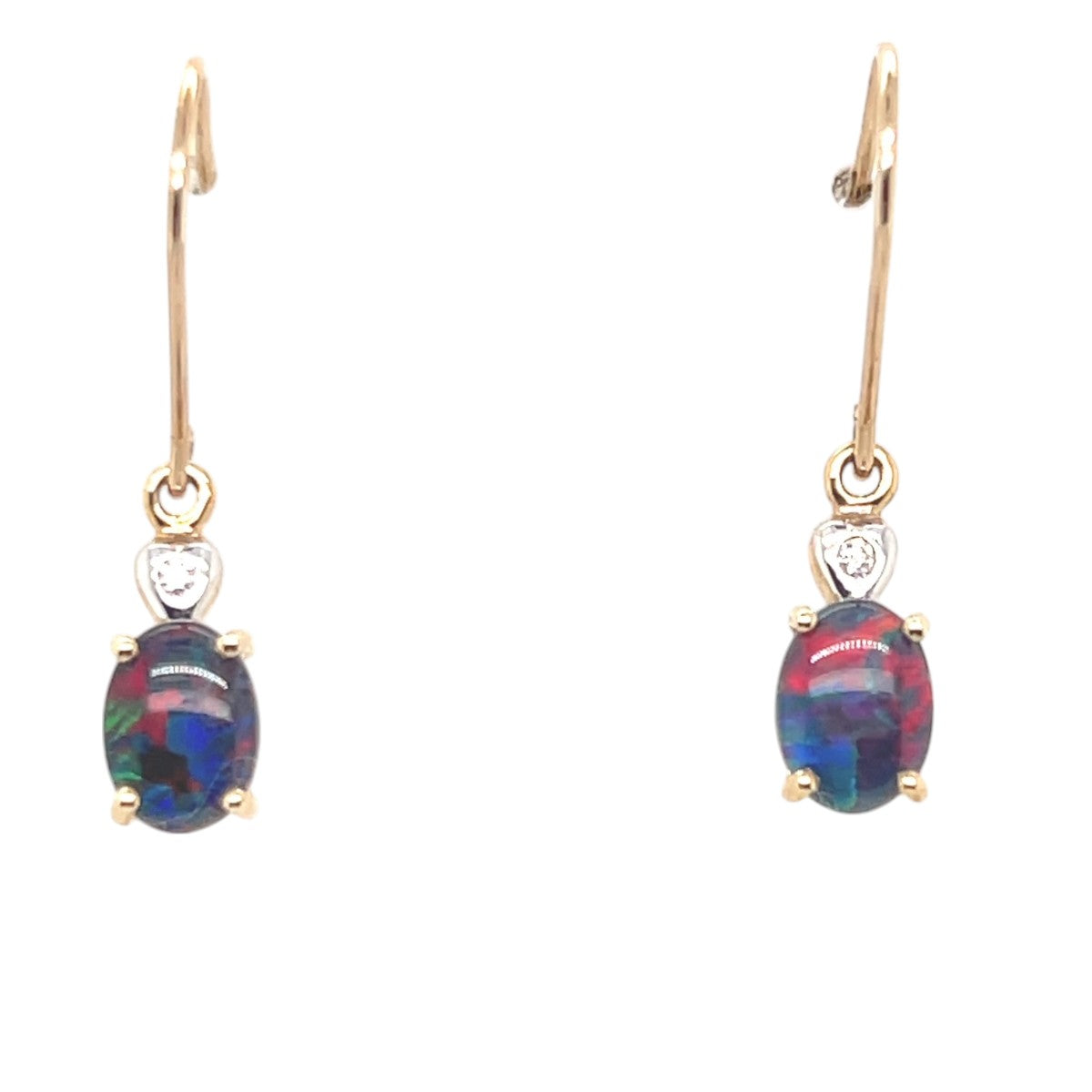 Unit price perSet in gorgeous 9ct yellow gold with a diamond, these triplet opal earrings were mined in Coober Pedy, located in South Australia and have shepherd hooks