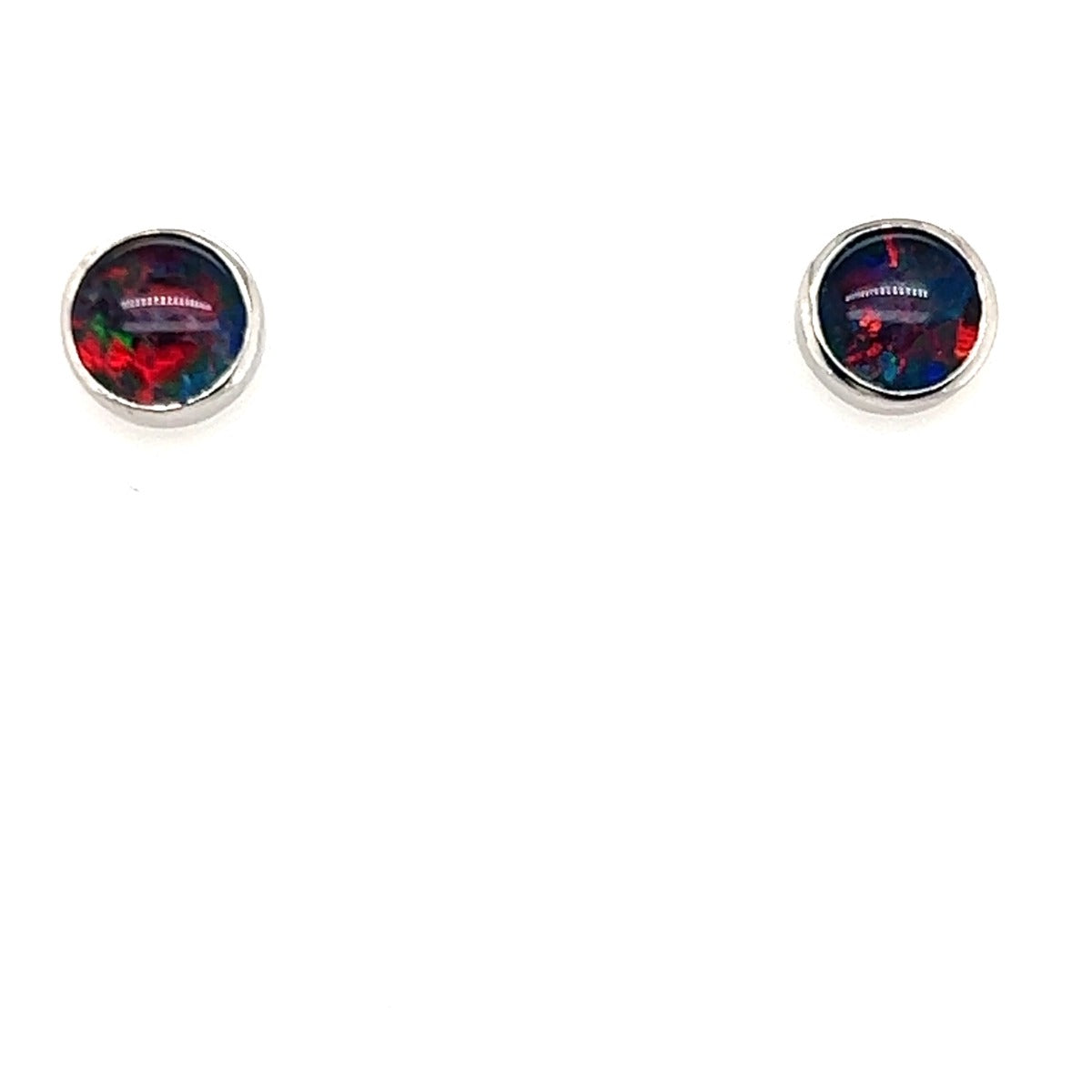 Set in a 9ct White Gold Bezel Setting, These Round triplet Opal Earrings have small flashes of Dark Blue and Fiery Red .