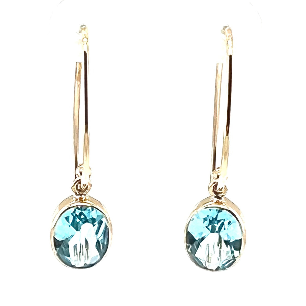 9ct yellow gold blue Topaz drop earrings set with a sheppards hook fitting