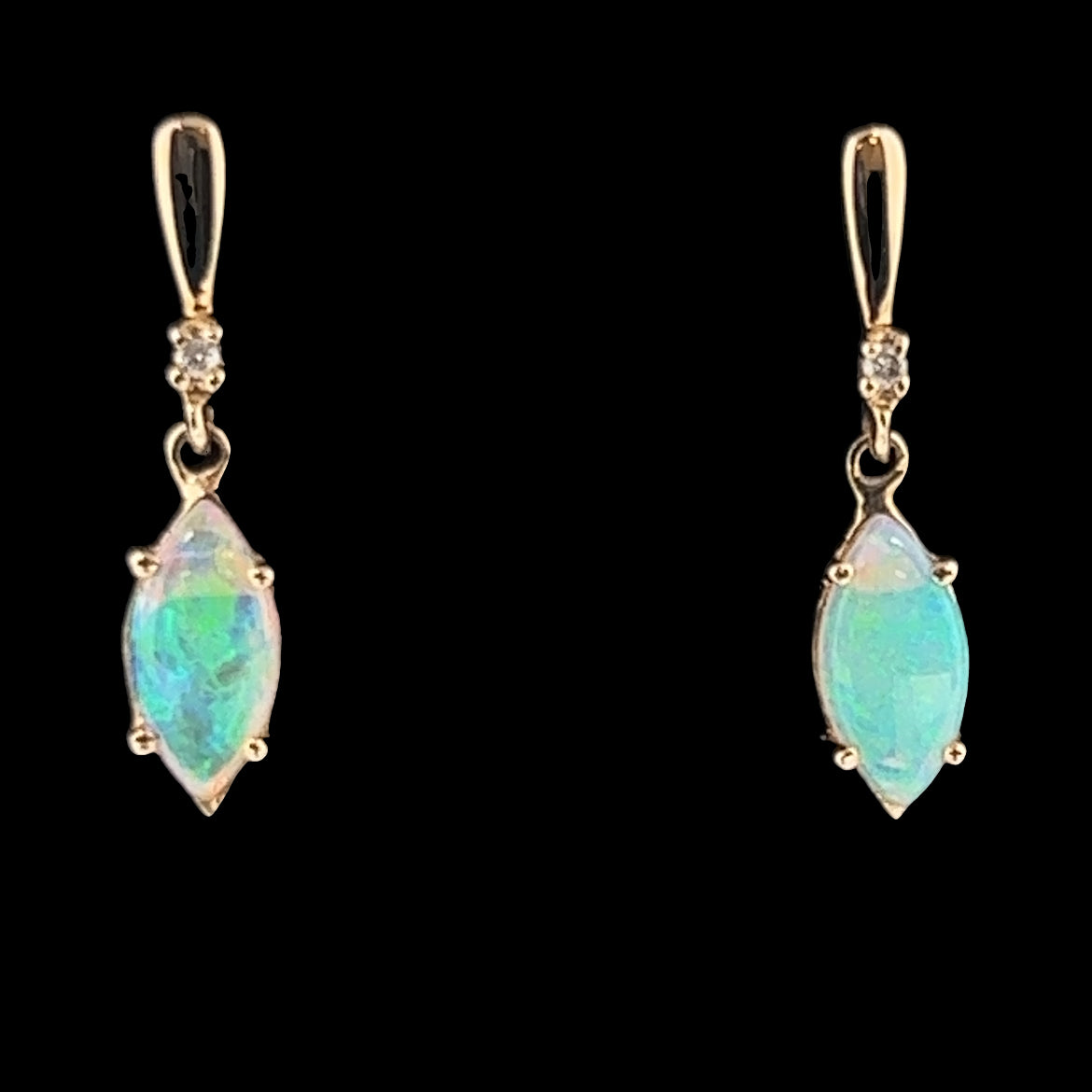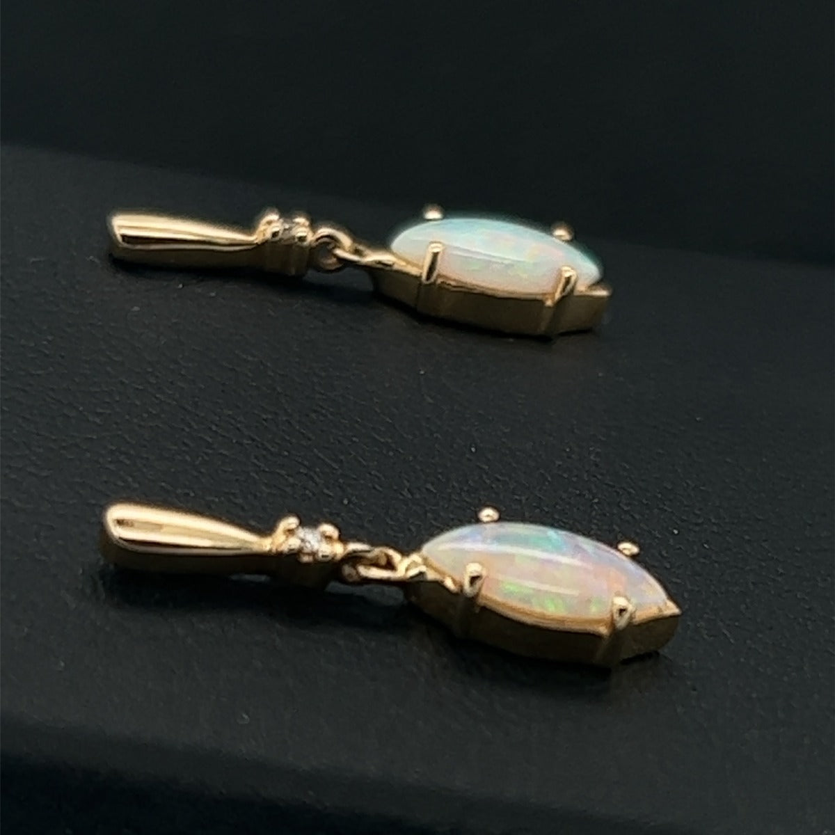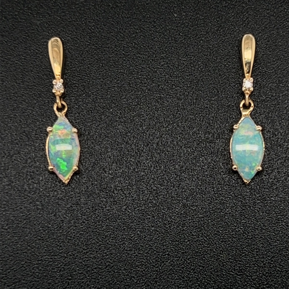 Unit price per14ct yellow Gold Drop Stud Design, Set with a Solid Marquise Cut Crystal Opal Stone 4mm(w) x 8mm(h) with Brilliant Blue, Red and Green Play Paired with a Stunning Melee Diamonds