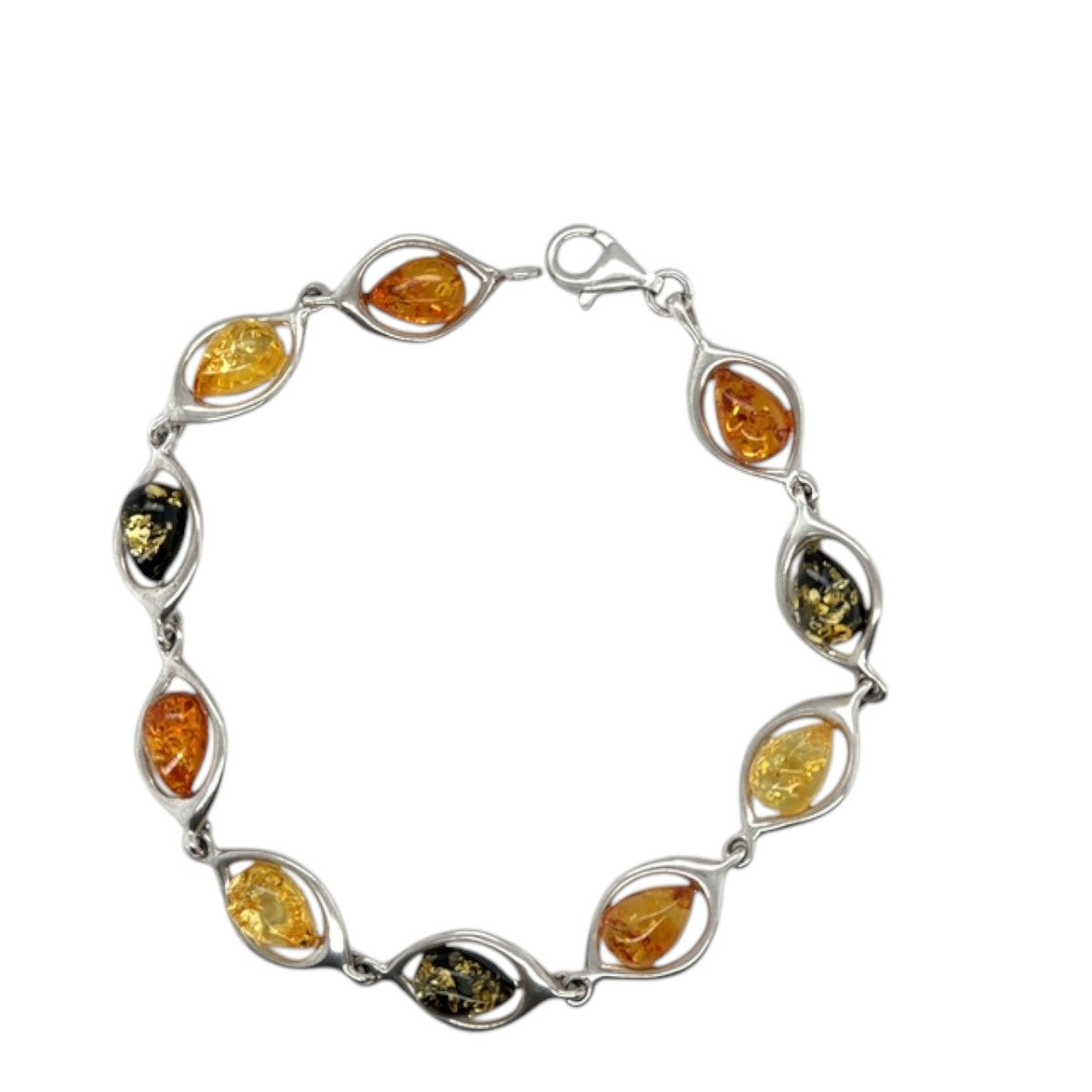 Sterling Silver amber bracelet set with 10 individual pieces of amber in multi colours