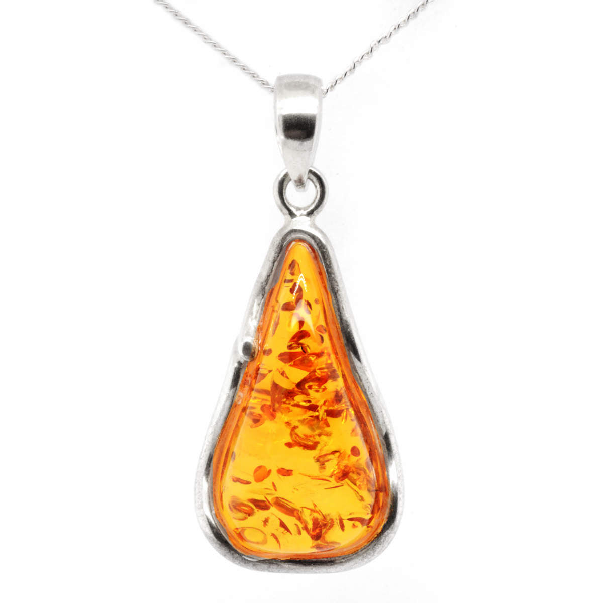 Set in Sterling Silver, This Pendant is Fitted with a freeform Drop Shaped Honey Coloured Amber Gemstones Sized Approx. 14mm(w)x28mm(h)