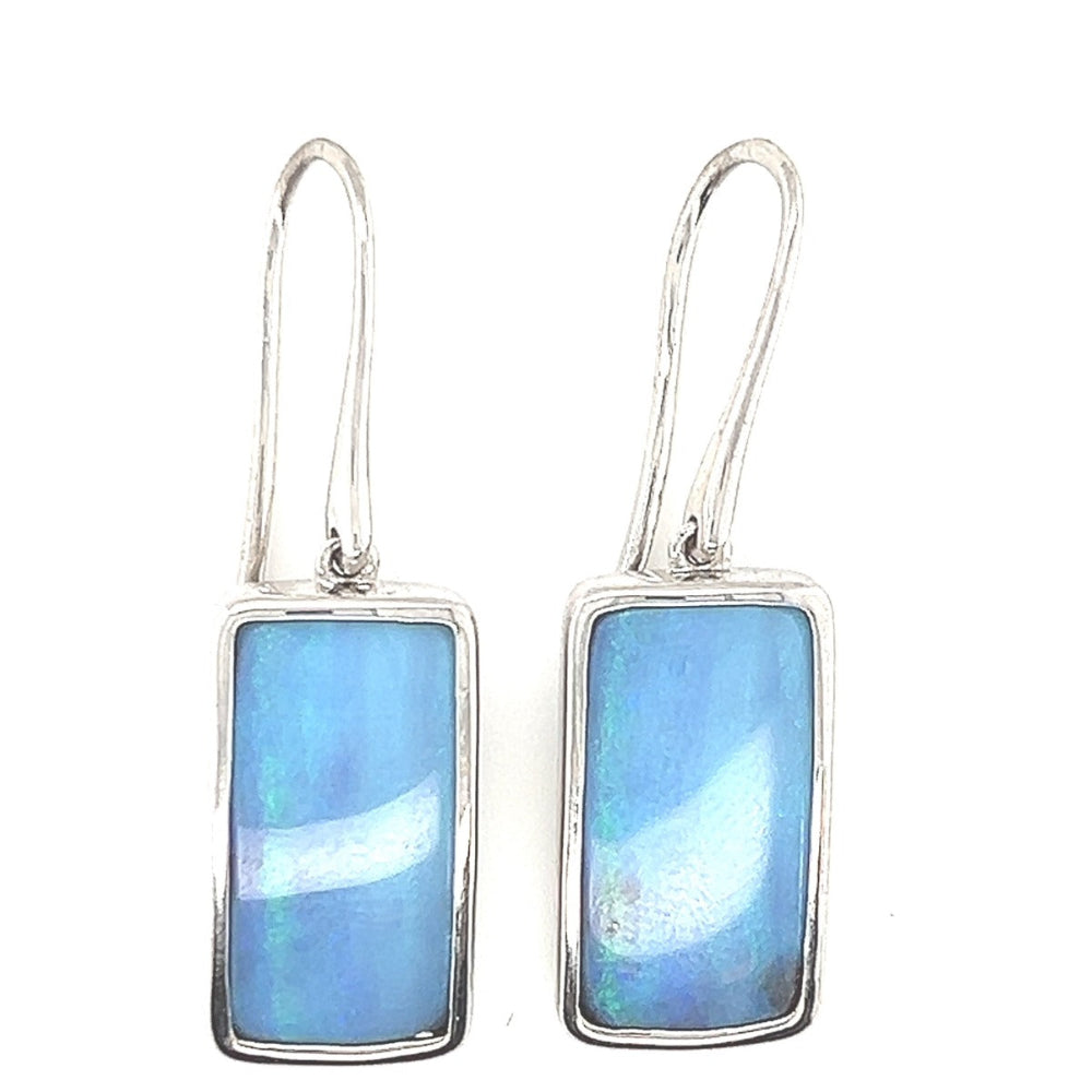 Sterling silver solid boulder opal drop earrings with beautiful blue colourings .