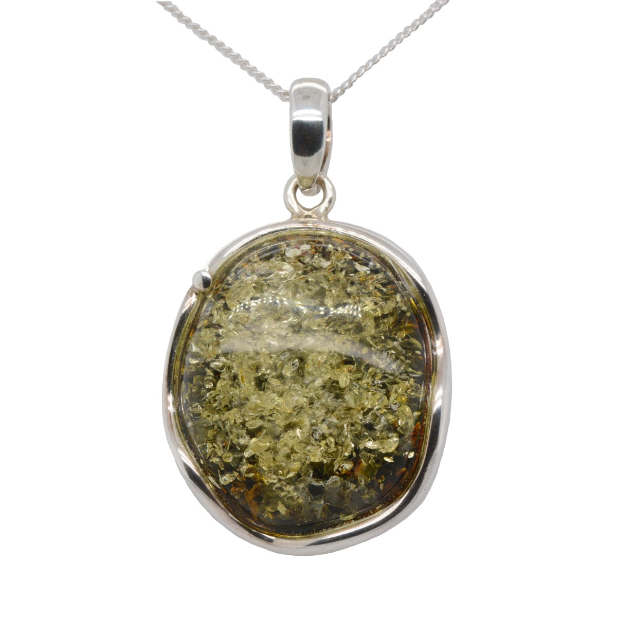 Crafted in shiny sterling silver, this unique olive green coloured amber gemstone is naturally sourced from the Baltic Region of Europe.