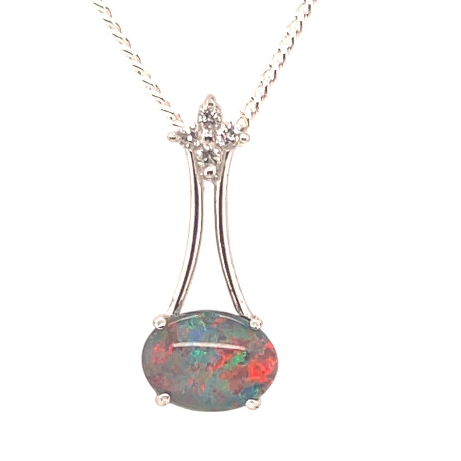 Unit price perThis dainty Sterling Silver Triplet Opal Pendant is accompanied by four cubic zirconia crystals.