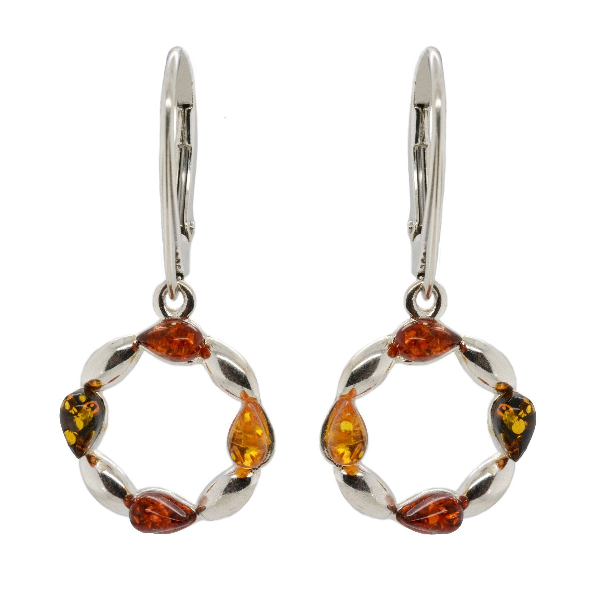 Crafted in a sterling silver setting, this piece is set with cognac, green and yellow amber gemstones, naturally sourced from the Baltic Region of Europe.